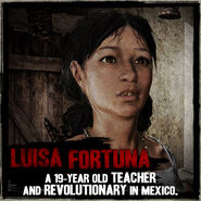 John get-go meets Luisa when he and Landon Ricketts rescue her from a regime jail at the bidding of her brother Emilio Fortuna. John soon discovers that Luisa has fallen for the leader of the local rebellion, Abraham Reyes, expecting that they will shortly marry. Quite to the opposite, Reyes only views Luisa (among other women) every bit a peasant and uses her for sex, while forgetting or confuses her name several times (often with "Laura") throughout the game. Regardless, she remains unendingly true-blue to him and his rebellion. Luisa is unconcerned about about how Reyes views her and how he forgets her name she all the same loves him and still cares for the his rebellion no matter what happens and no matter what Reyes says or does. Because of her beloved and loyalty to him and her country Luisa is willing to practice anything for Reyes rebellion.